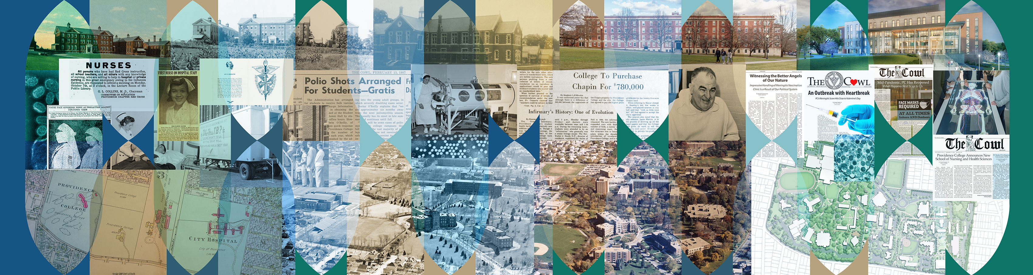 This dynamic visual narrative traces the interwoven stories of healing, education, and place at Providence College. Through three distinct timelines—layered across the top, middle, and bottom of the wall—the Mondor Mural reflects the transformation of this historic site, from its origins as Chapin Hospital to the establishment of the Ben Mondor Center for Nursing and Health Sciences. Incorporating the college’s archival photographs, maps, headlines, and personal reflections, the stories encourage viewers to consider how the past informs progress.