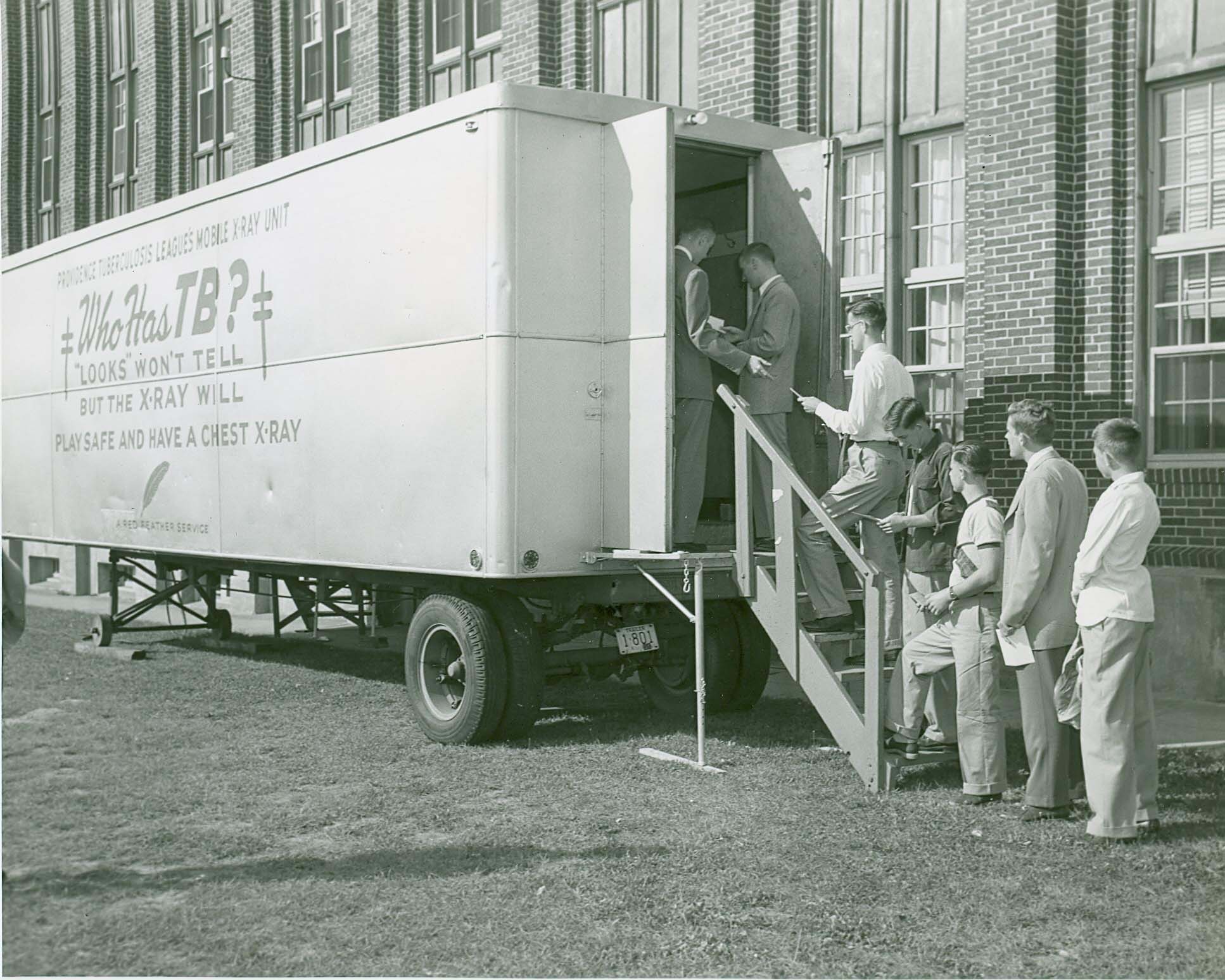 - en Black and white image of students lined up outside a portable tuberculosis testing unit during the 1951 Freshman orientation at Providence College.