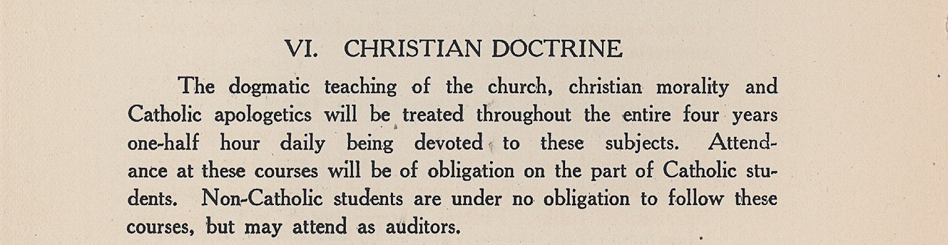 A scanned page from a 1920 academic catalogue detailing Christian Doctrine coursework, including mandatory attendance for Catholic students and optional auditing for non-Catholic students.