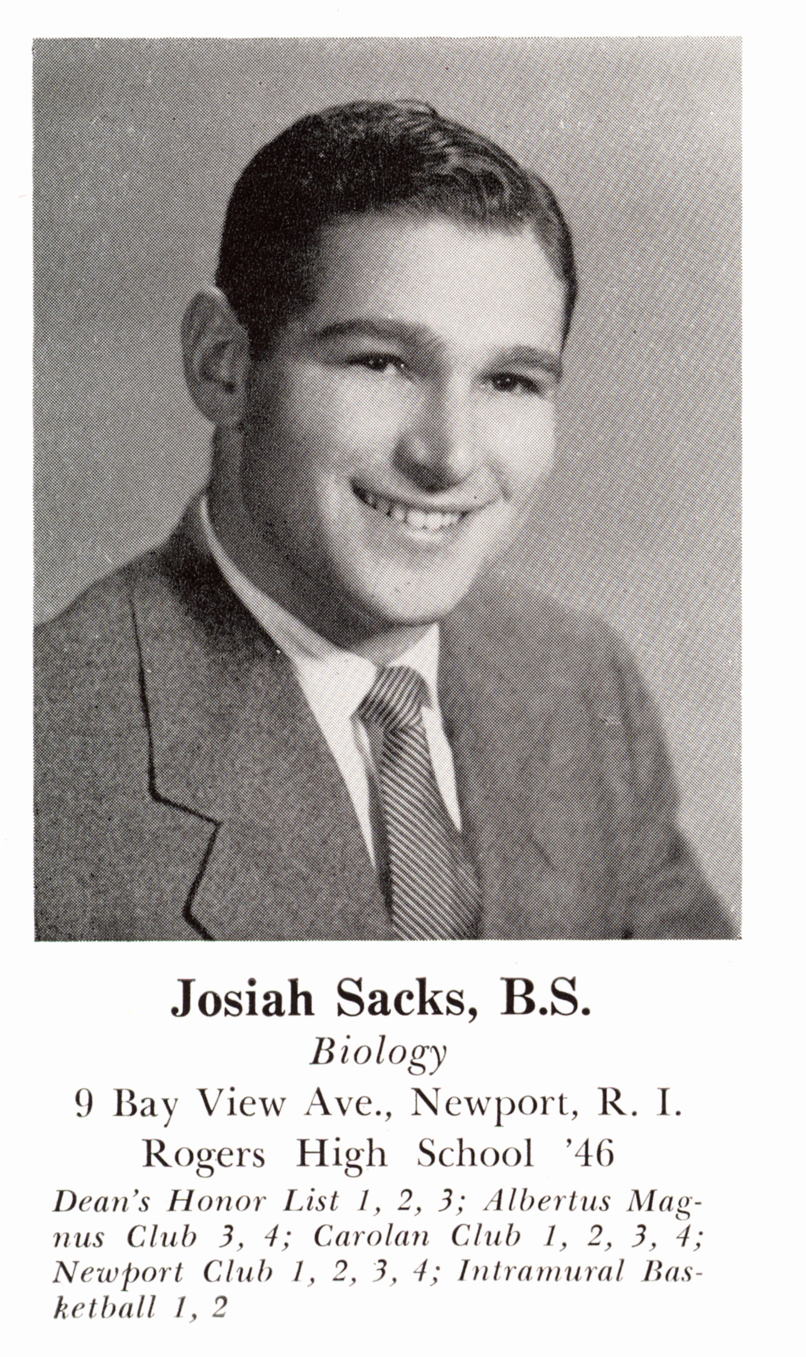 Yearbook photo of Josiah Sacks in a suit and tie, with accompanying text listing academic achievements and club memberships.