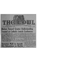 Front page of the November 20, 1963 issue of "The Cowl" from Providence College, featuring articles on a Catholic-Jewish conference promoting interfaith understanding and an upcoming speech by Senator Pell on the Berlin situation.