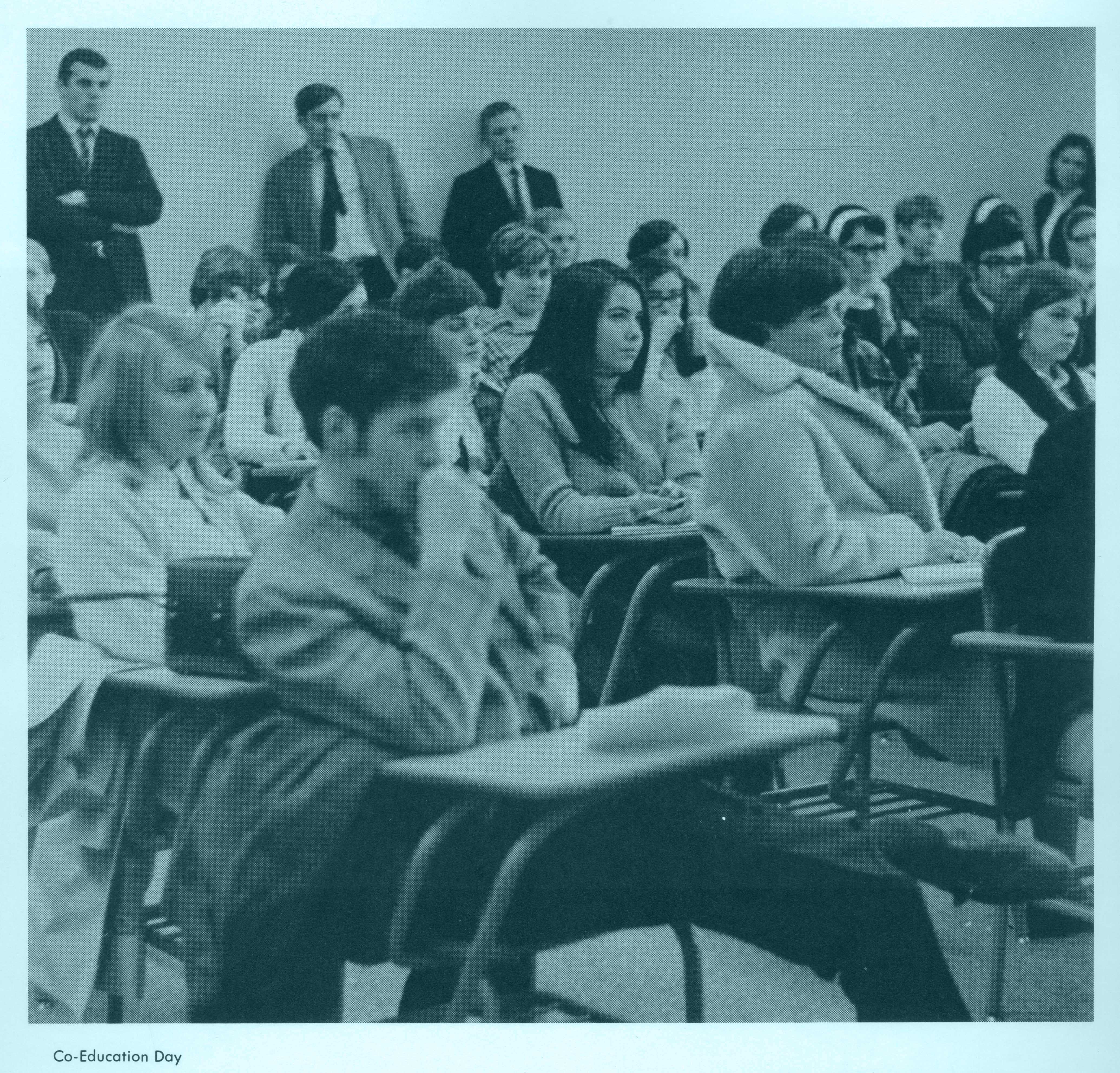 - en Students from Providence College and Salve Regina University sit in a classroom at PC in 1968. Both schools were single-gender at the time and orchestrated coeducational days where students from each school visited and took part in classes and social activities.