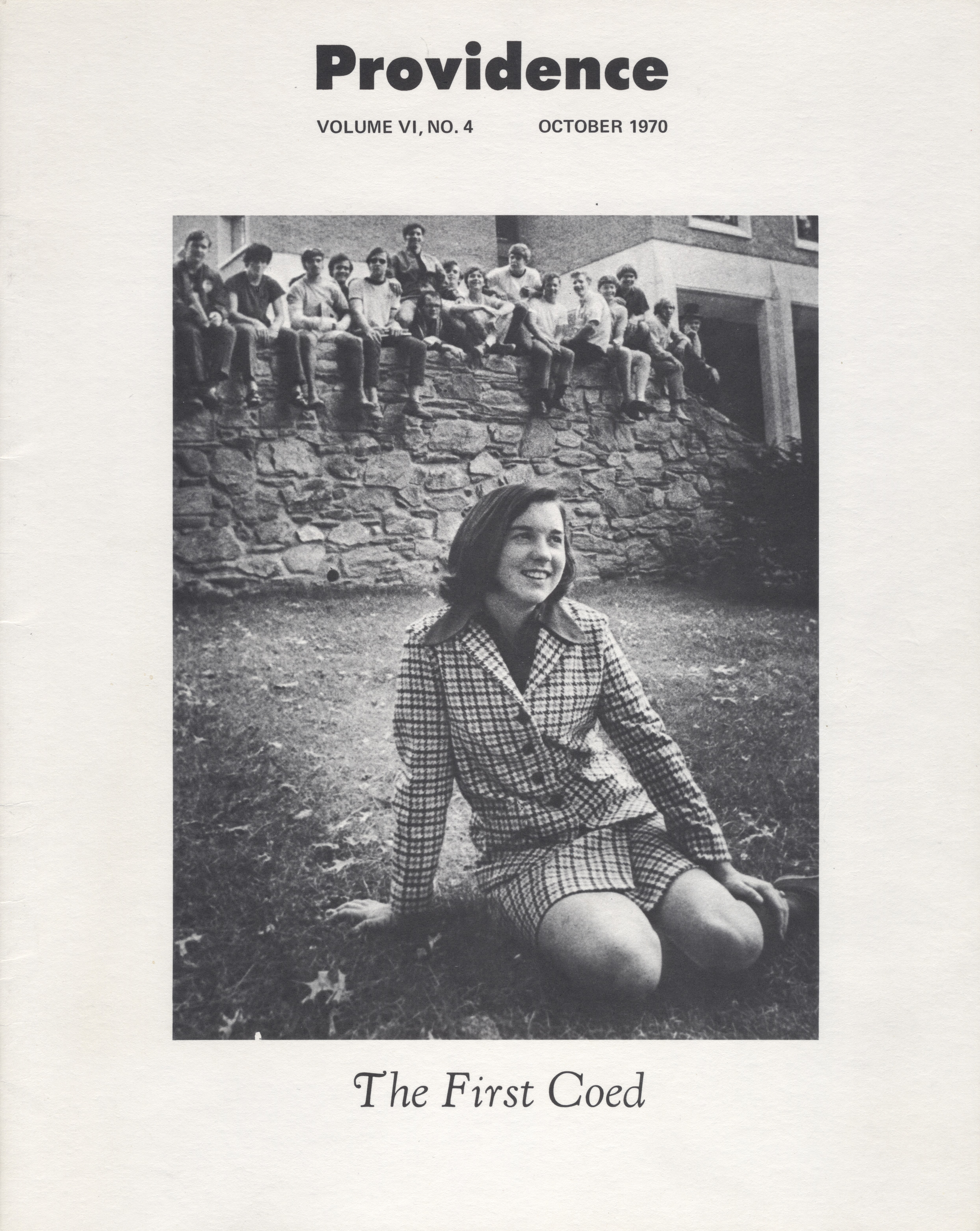 - en Cover of Providence College Magazine, October 1970. Cover image features Maureen Whelan in the foreground with male students sitting on the stone wall in the background.
