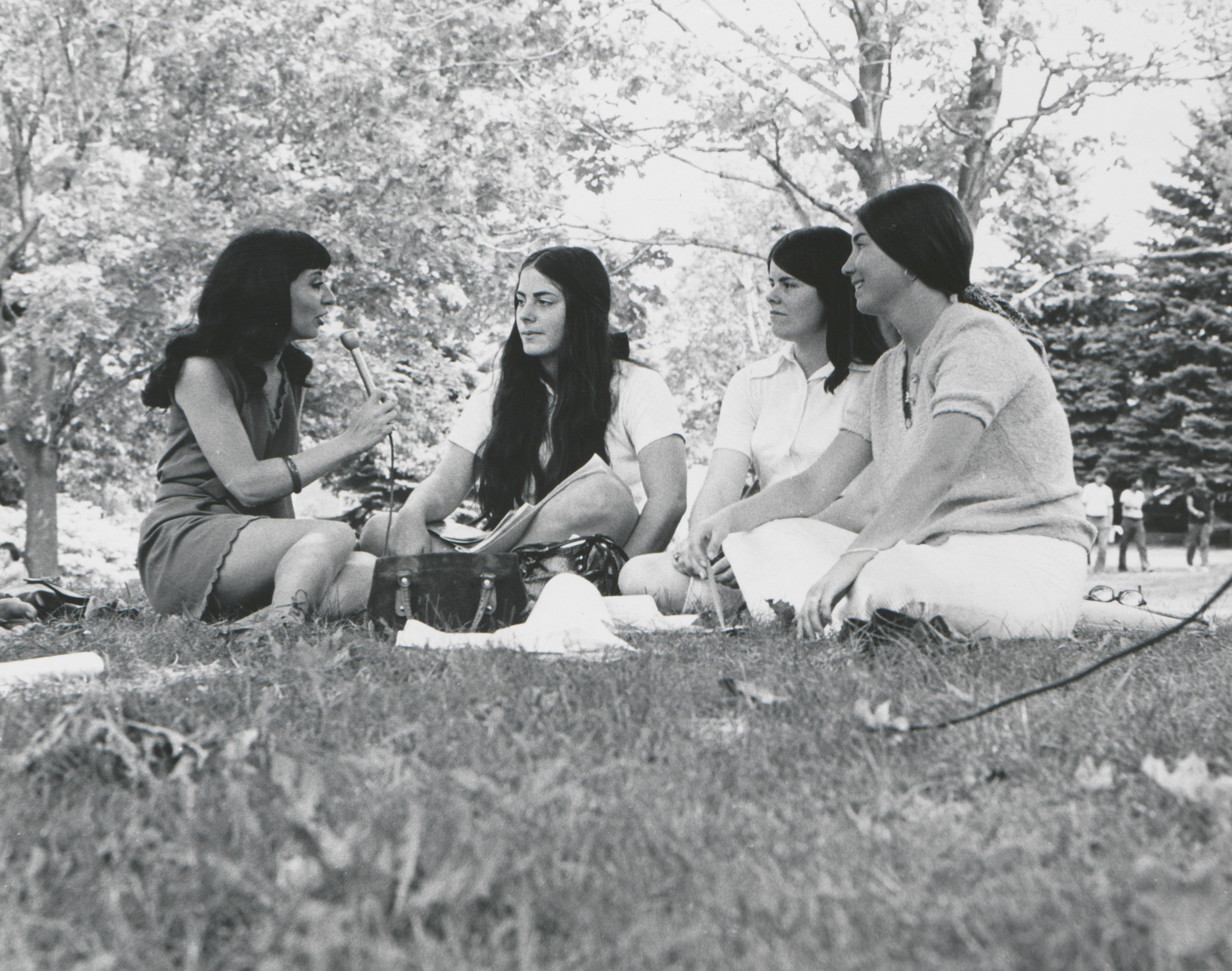 - en A journalist sits in the grass and holds a microphone in front of three women college students at Providence College, fall 1971.