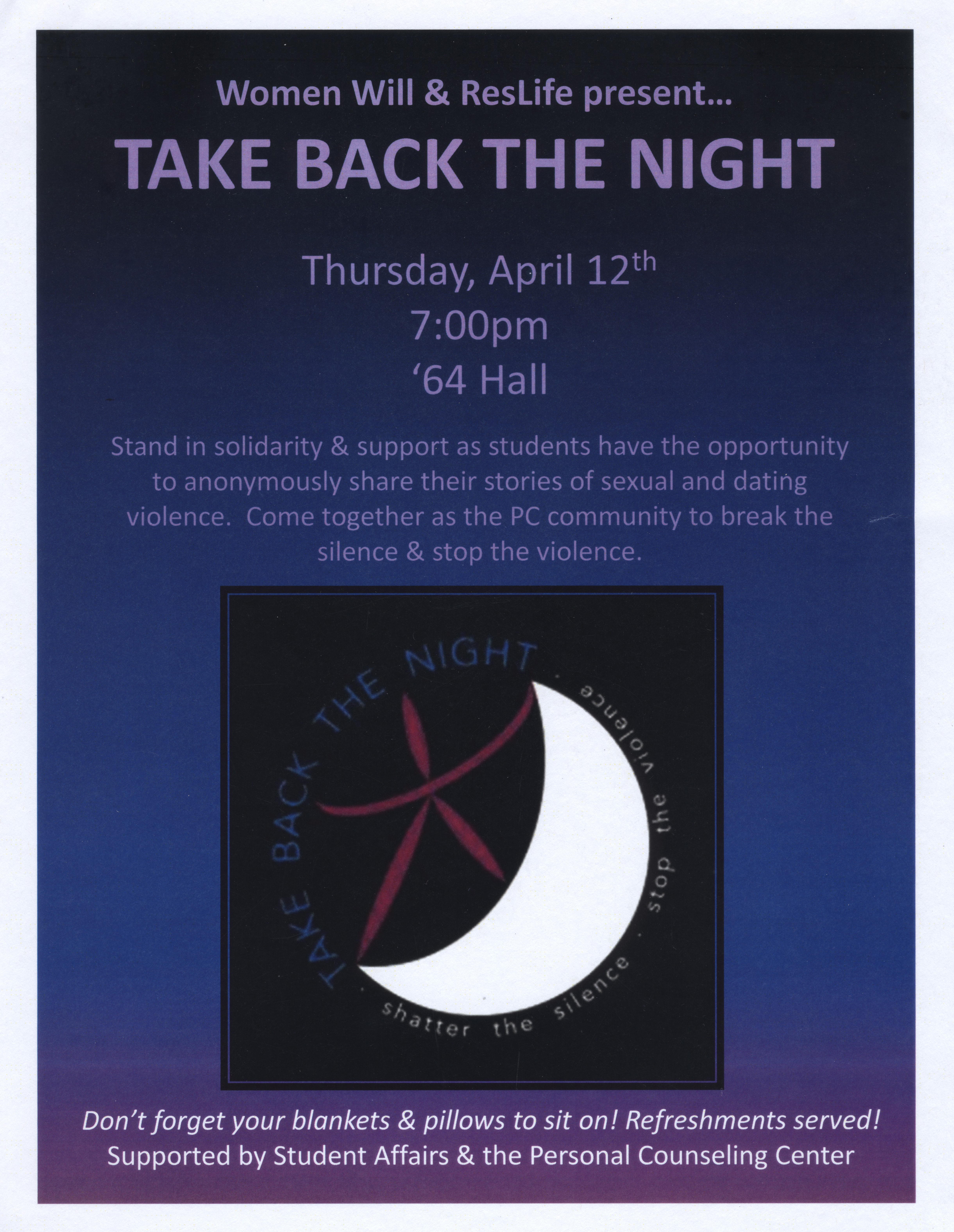 - en Take Back the Night flyer, undated. Event co-sponsored by Women Will and ResLife.