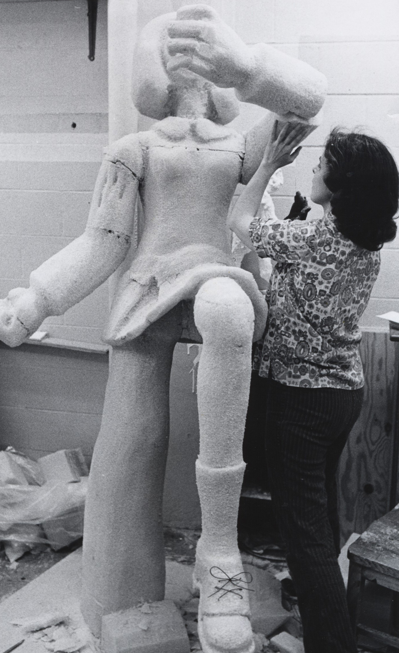 - en Sister Bernadine M. Egleston, O.P. works on a large sculpture in the studio. She earned a BA in Art from Providence College in 1972, becoming the first woman to receive an undergraduate degree from the day school.