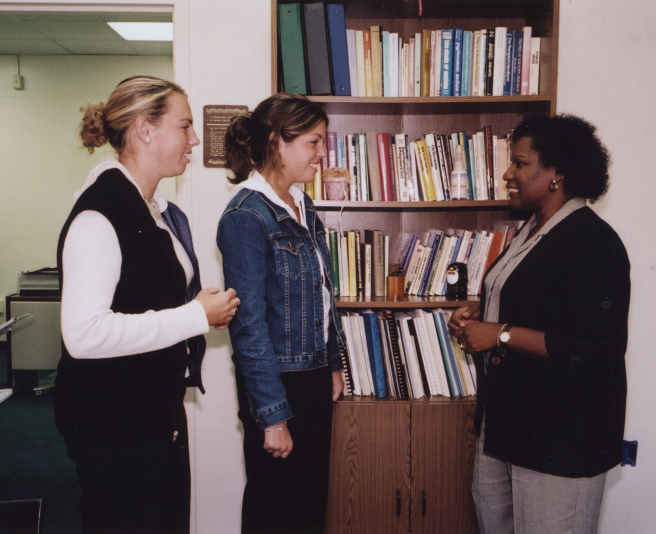 - en Wanda S. Ingram, Ed.D. '75, stands in an office speaking with two students. Ingram served three decades as academic advisor and undergraduate dean at Providence College. She retired as senior associate dean of student academic success in July 2023.