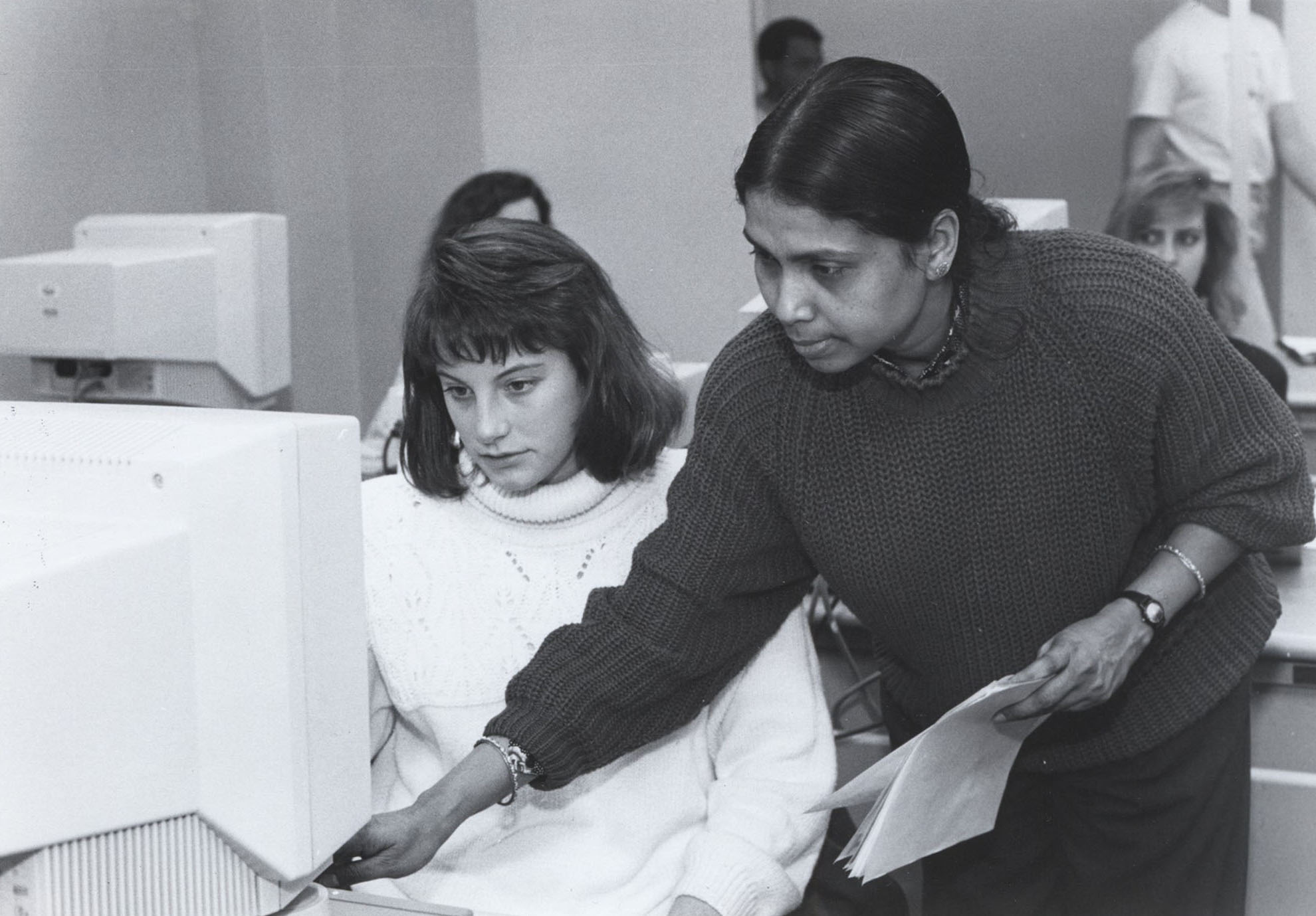 - en Dr. Nazma Latif-Zaman, economics professor, assists student at a computer station.