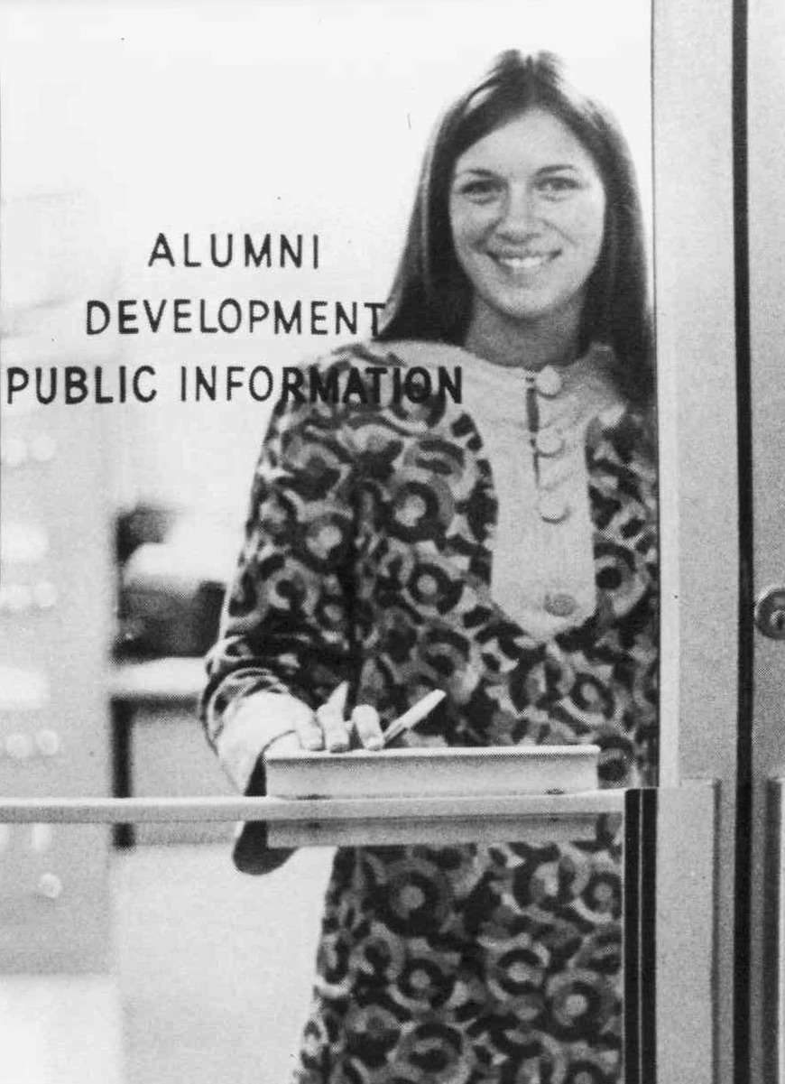 - en Karen Roy stands behind a glass door to the Alumni Development Office where she worked.