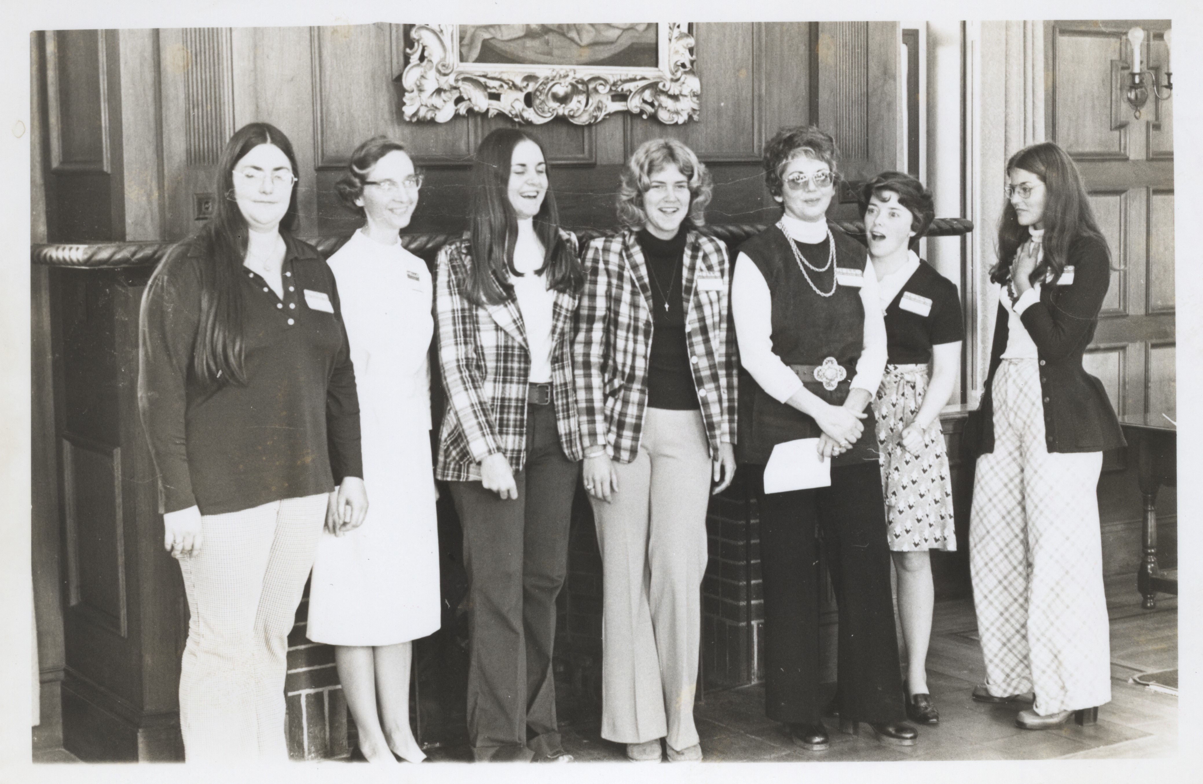 - en Group portrait of the faculty and staff Women's Liason Committee, 1973-1974. Formed as a support network for female students, the Women's Liason Committee hosted events and provided informal mentorship.