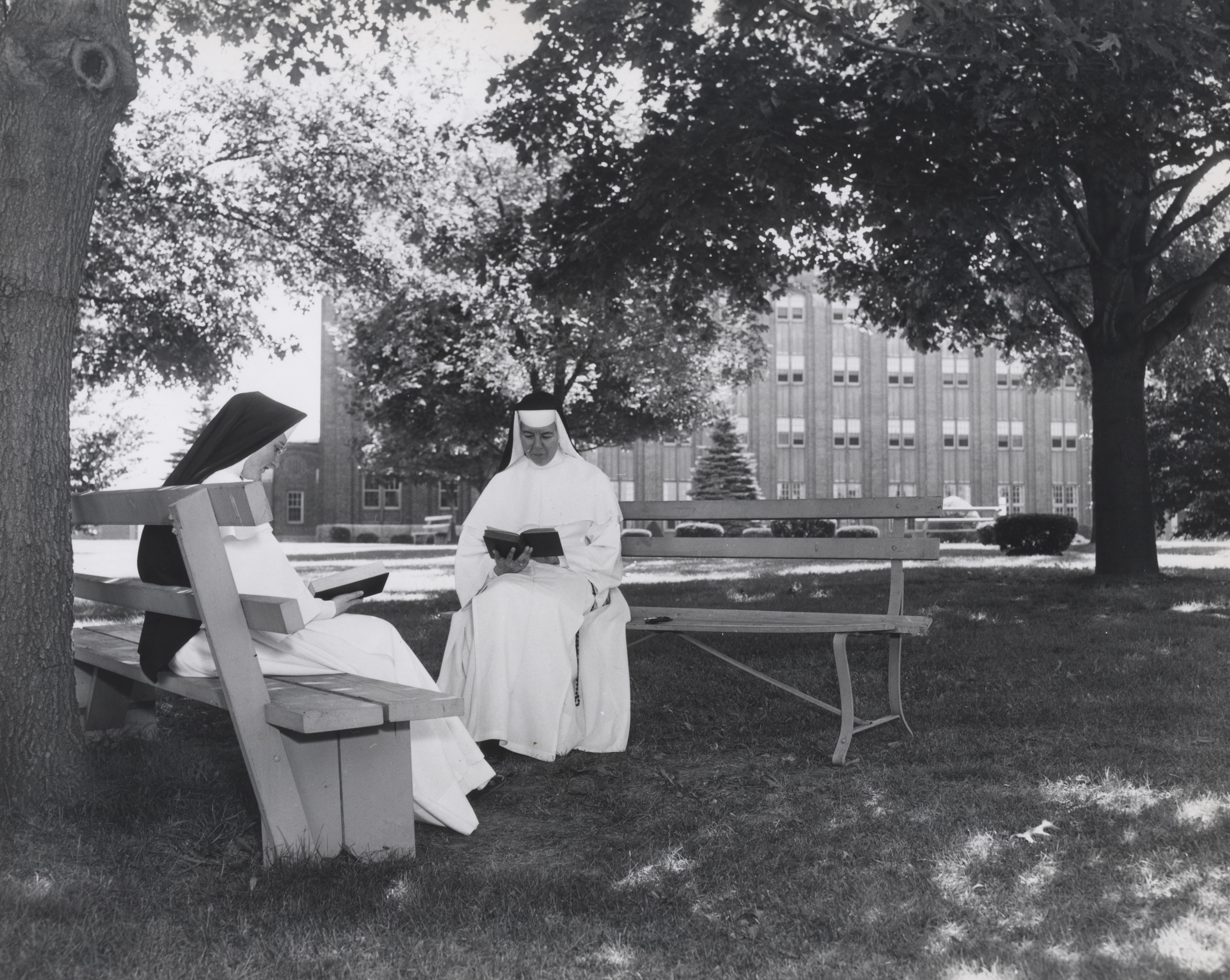 - en Two nuns sit under the trees on Providence College campus while reading.
