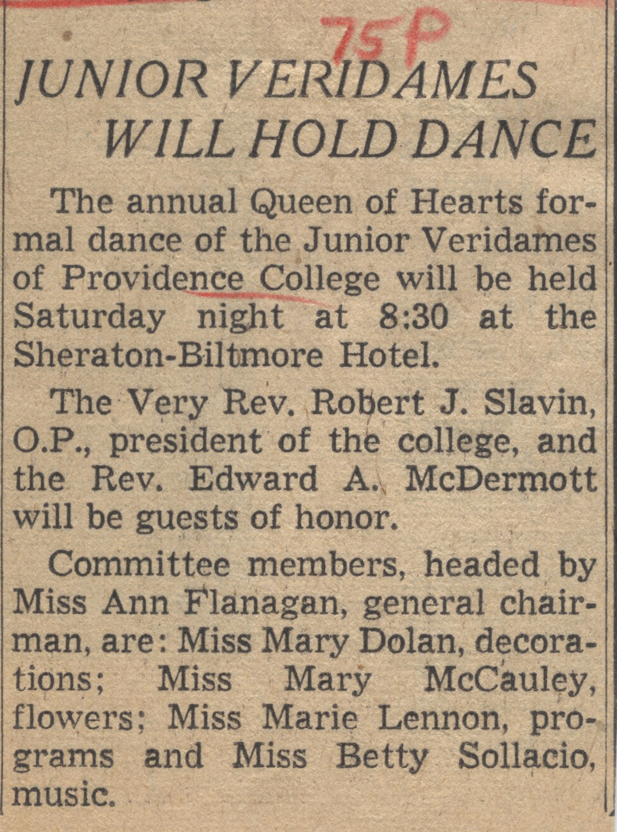 - en Newspaper clipping promoting the annual Queen of Hearts dance hosted by the Junior Veridames.