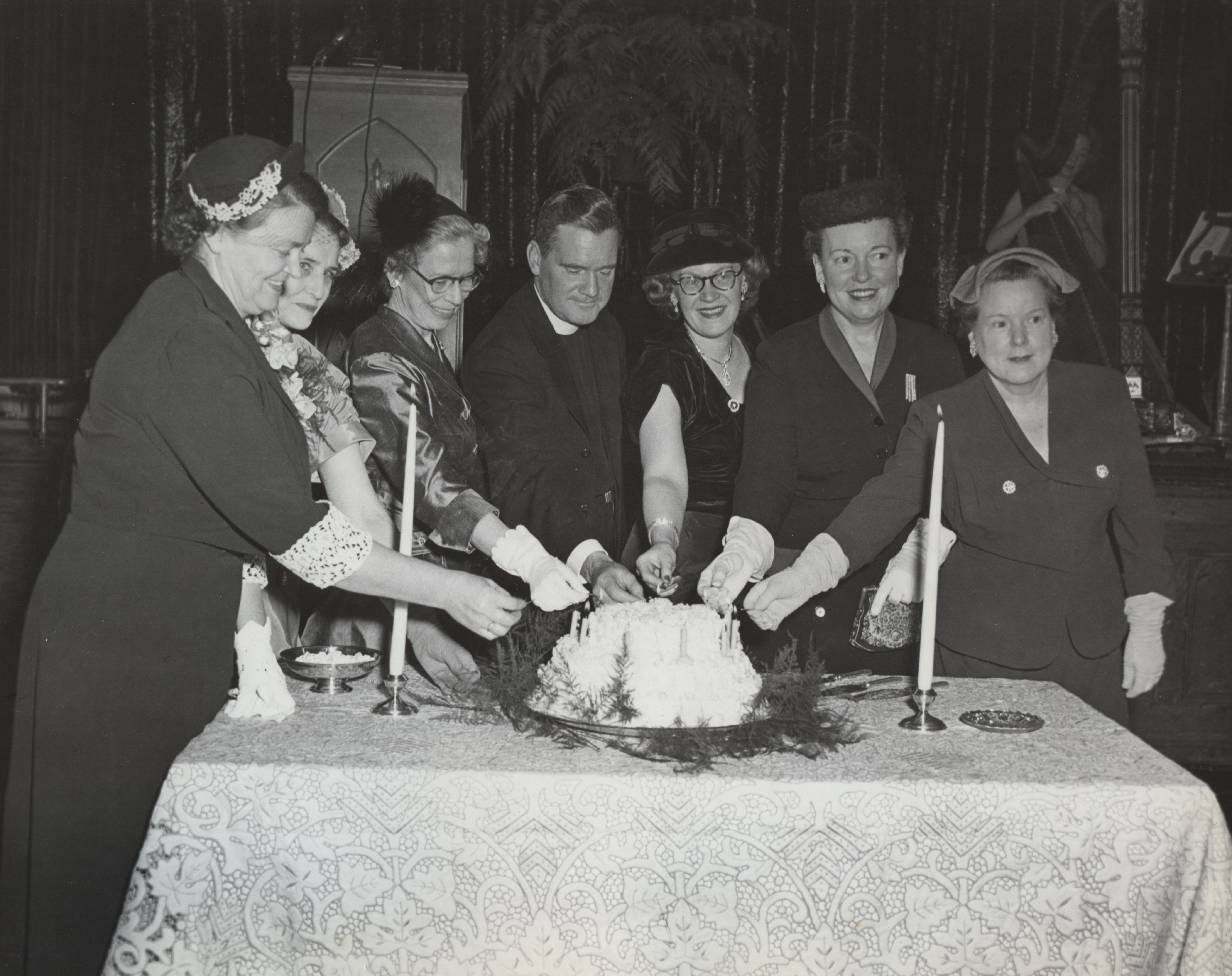 - en Veridames members and Rev. Edward McDermott cutting a cake at the Musicale and Tea event hosted by the auxiliary group. L-R: Miss Regina McPhillips, Mrs. Francis O’Brien, Miss Sara Conlon, Rev. Edward McDermott, Miss Miriam Geoghegan, Miss Anna Cottam, Mrs. James F. Colgand