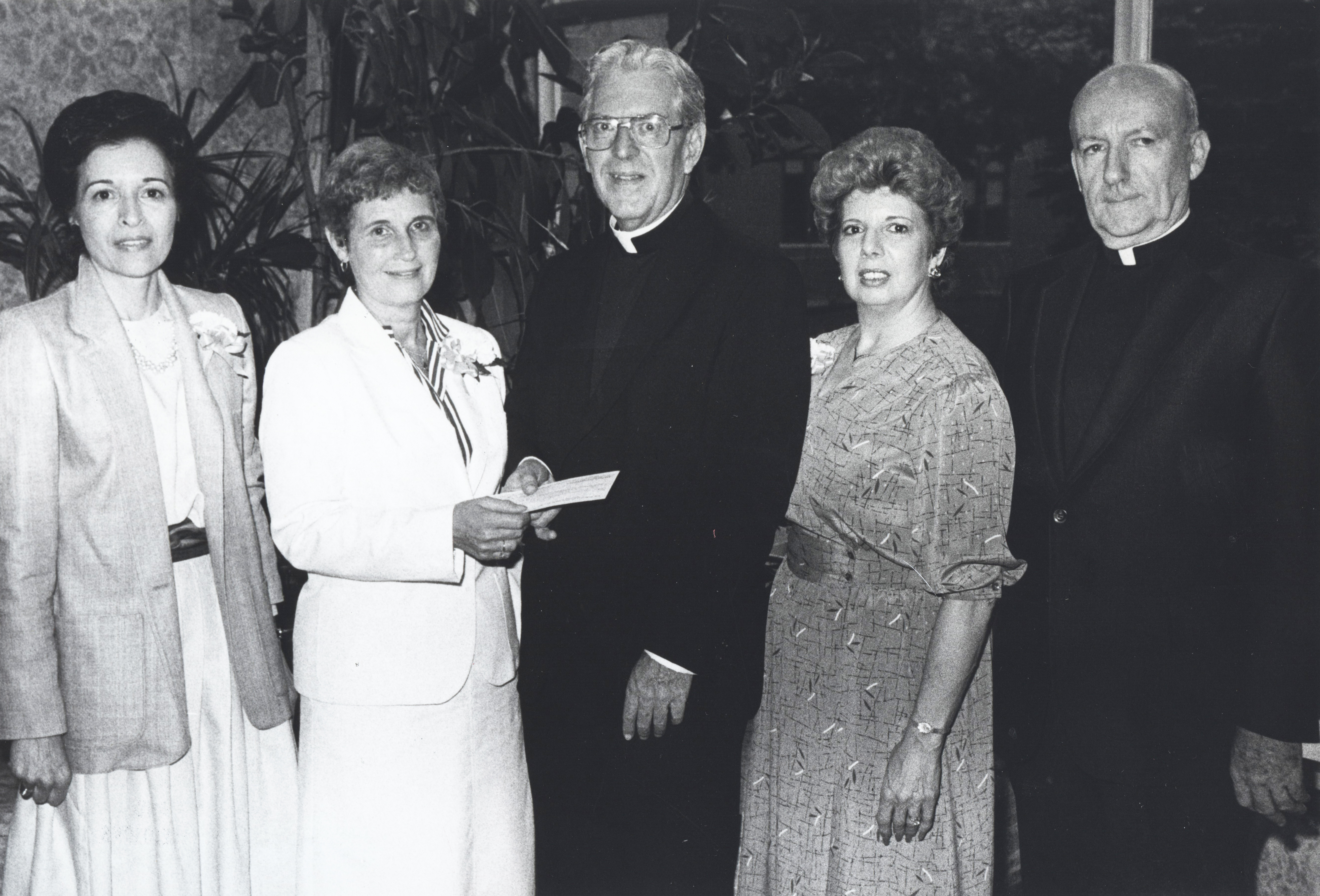 - en Members of the Veridames present Fr. Peterson with a check for scholarship funding raised by the group.