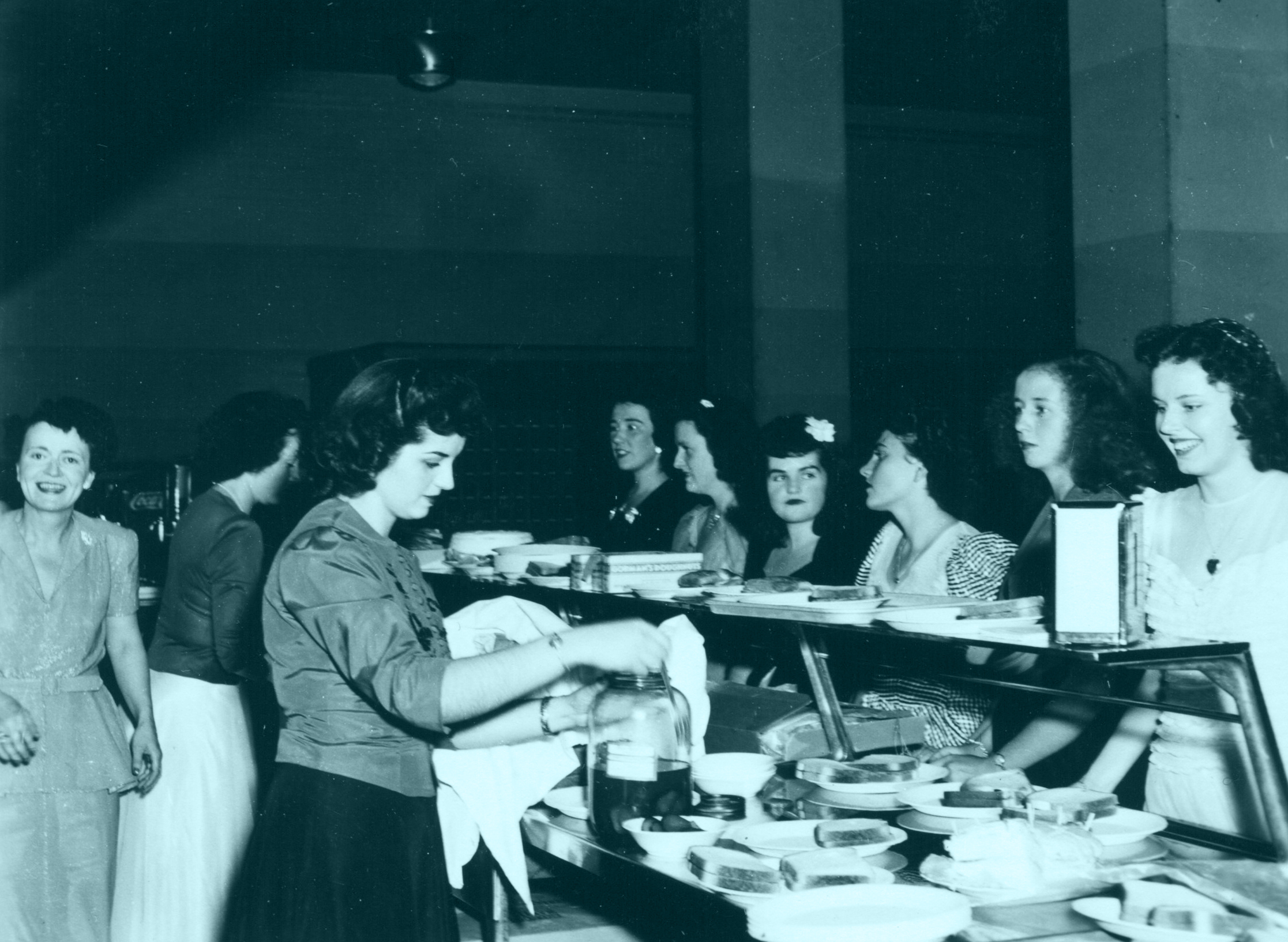 - en Junior Veridames line up for a meal at a cafeteria during a speakers program.